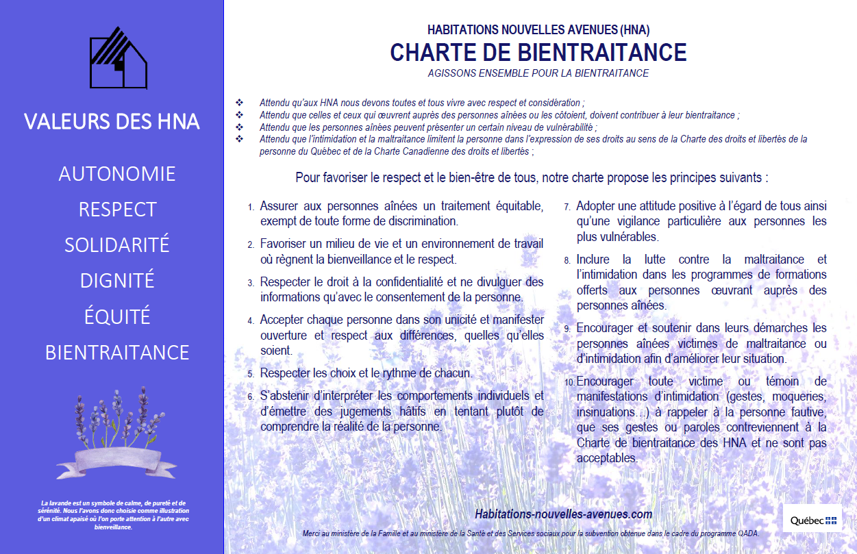 Suite à ce projet, nous avons travaillé à l’élaboration de plusieurs documents pour souligner le virage de bientraitance qu’a entamé les HNA. Elle nous rappelle les principes directeurs de la politique de bientraitance. Nous l’avons affiché aux différentes entrées des trois phases.