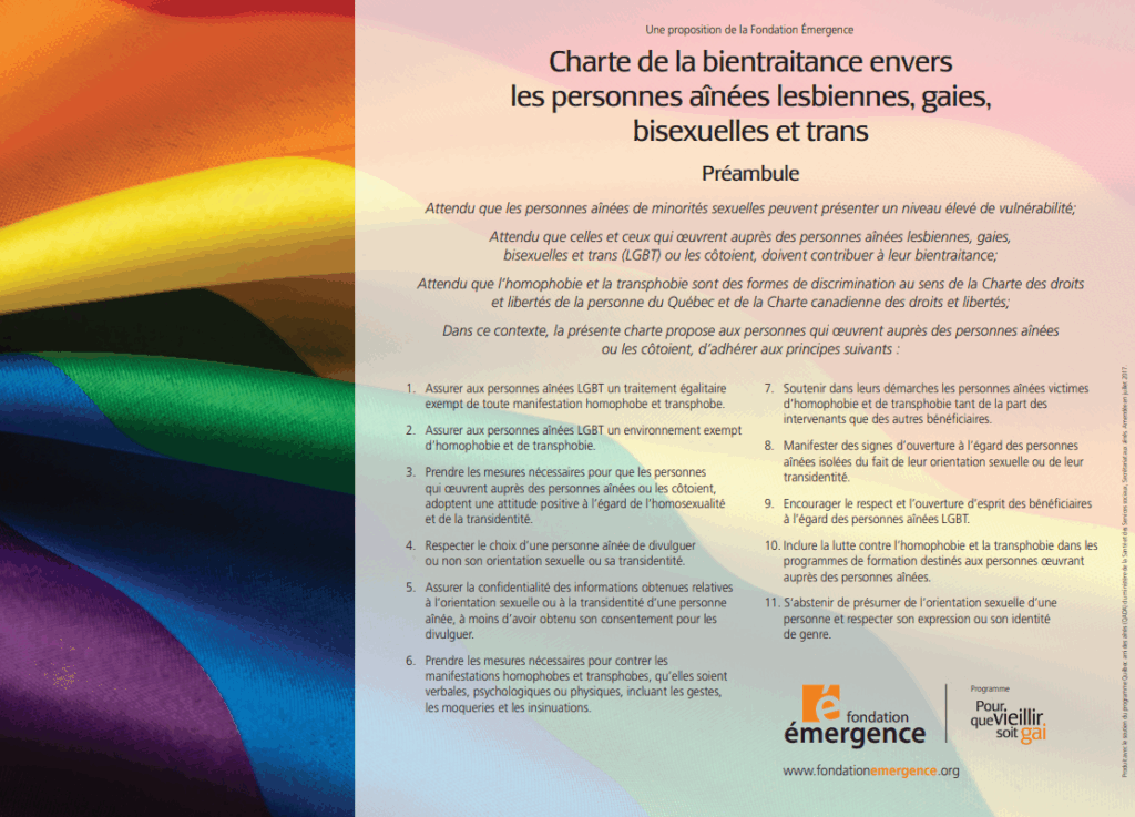 La Charte de la bientraitance envers les personnes aînées lesbiennes, gaies, bisexuelles et trans de la Fondation Émergence.