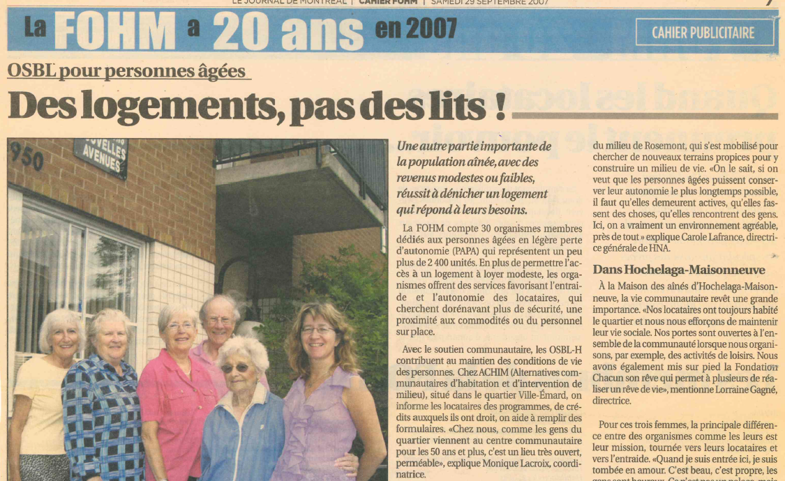 - Article paru dans le Journal de Montréal en septembre 2007 à propos de la FOHM à l’occasion de ses 20 ans d’activités : Article Journal de Montréal – septembre 2007 – dossier de la FOHM.